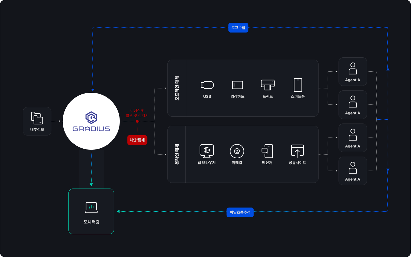 GRADIUS DLP는 이러한 요구를 완벽하게 충족시키는 보안 솔루션으로서, 보안 시스템 뿐만 아니라 대내·외적 Compliance에 대비한 기술적 조처를 제공하는 효율적이고 실질적인 솔루션 입니다.