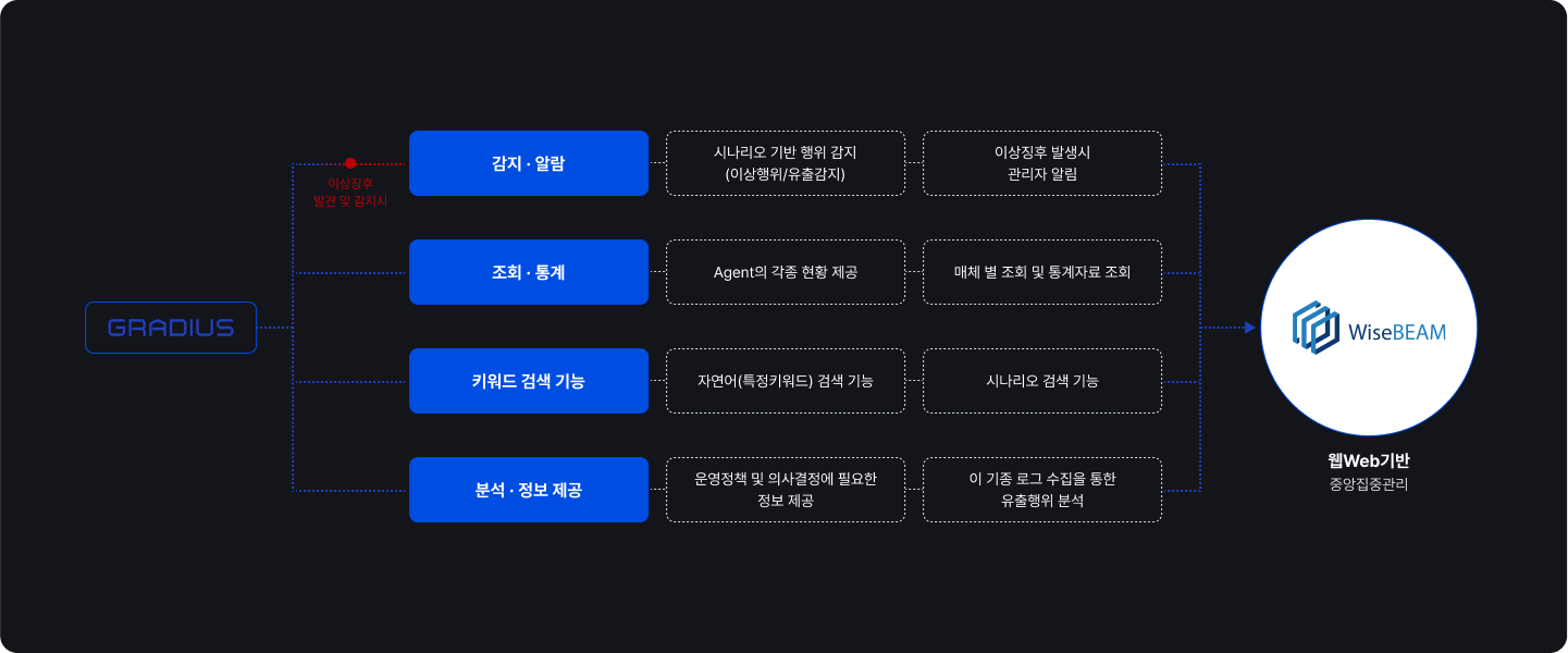 WiseBEAM은 Gradius DLP를 이미 구축했거나 구축 예정인 고객사와 종합 정보유출 관제 시스템을 갖추고자 하는 기업에게 필요한 제품입니다.