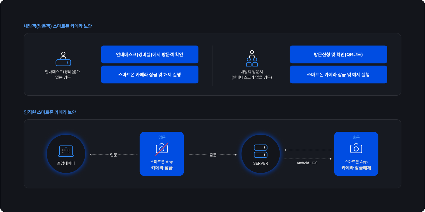 스마트폰 카메라를 통한 정보 유출 위험이 증가하는 가운데, 기업 보안이 중요한 모든 사업장은 보다 강력한 보안 솔루션을 필요로 하고 있습니다. 특히, 외부 방문객의 출입이 잦거나 내부 정보 보호가 필수적인 금융, 제조, 연구소, 공공기관 등의 환경에서는 내방객의 스마트폰 카메라 사용을 철저히 통제할 수 있는 시스템이 요구됩니다.